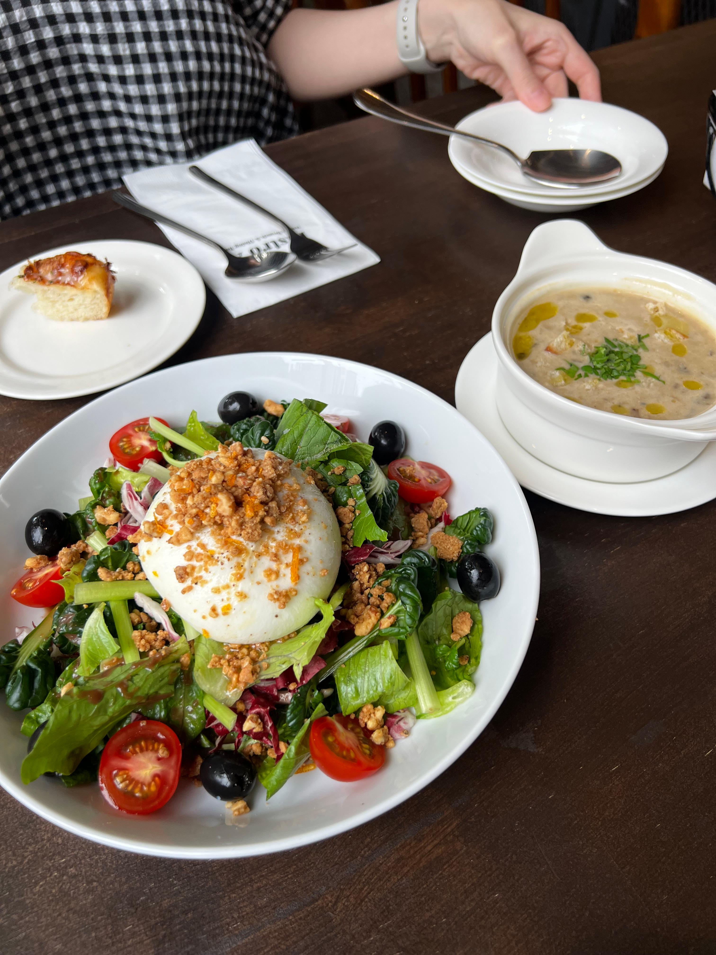 그릭샐러드가 나오고 곧바로 주문한 트러플 크림 수프가 나왔다. 그릭샐러드는 위에 올라간 수제 치즈가 특히 맛있고 채소가 싱싱해서 식감이 좋았다. 트러플 크림 수프는 트러플이 많이 들어가진 않아 조금 아쉬웠지만 맛있었다.