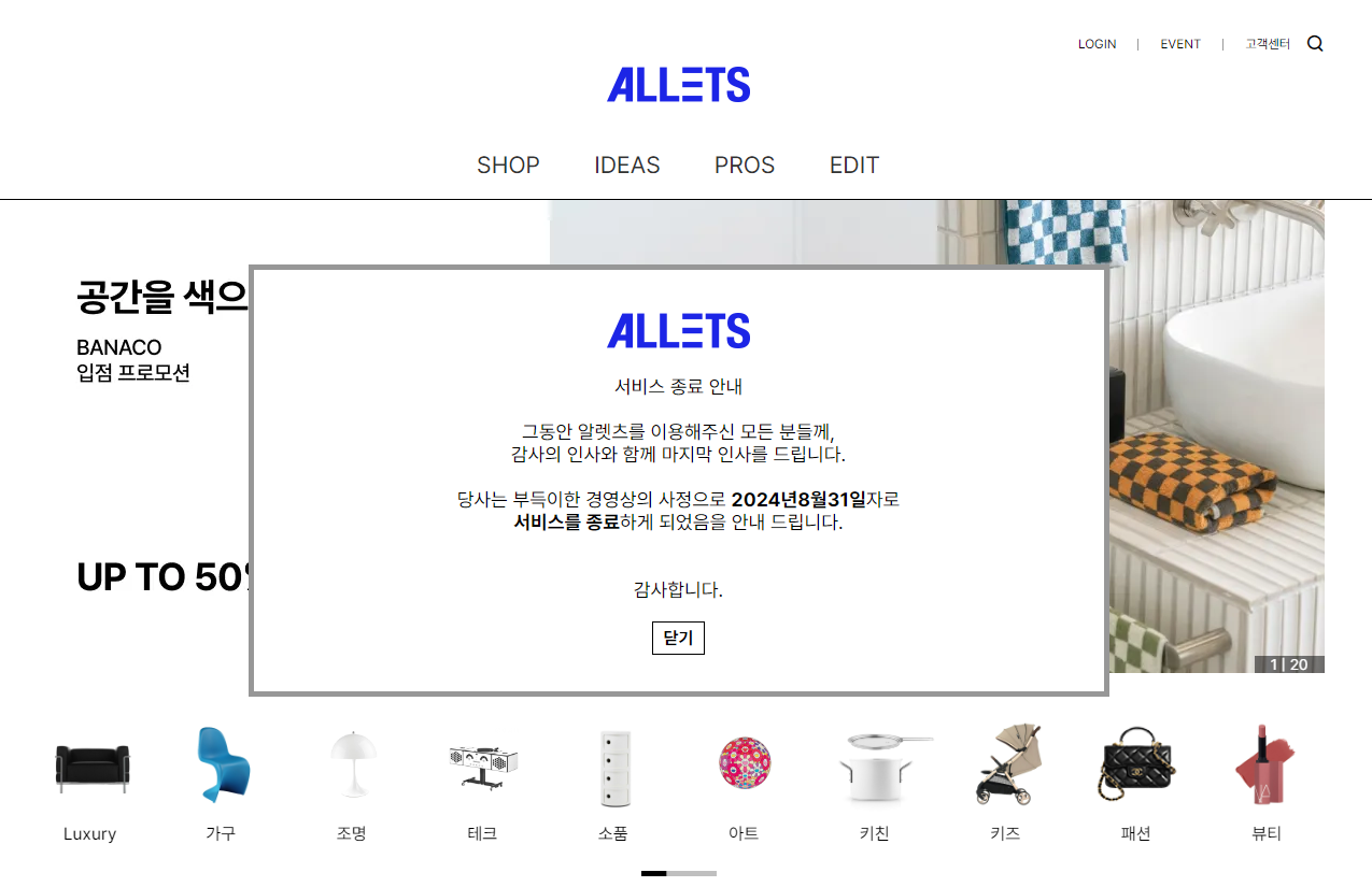 최근에 카메라 렌즈를 구매했던 판매자로 부터 정산금을 받지 못 할 위기에 처해있어서 제품 반품을 해달라는 문자를 받았습니다. 무슨일인가 하고 구매를 진행했던 알렛츠 사이트에 오늘(8/17)들어가보니... 서비스 종료 안내 공지가 떠 있네요.